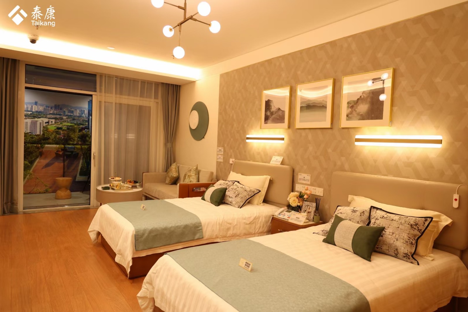 泰康之家在公共区域和房间内采用适合老化的设计,以确保老年人的安全和舒适。公共区域采用无障碍地面设计,安装安全扶手,方便轮椅和老年人轻松通行;同时,每个区域都配备了提升报警系统,以及时应对各种紧急情况。房间内部采用圆角家具,防止碰撞。同时,采用大字符电话、长柄水龙头等适合老年人的设备。